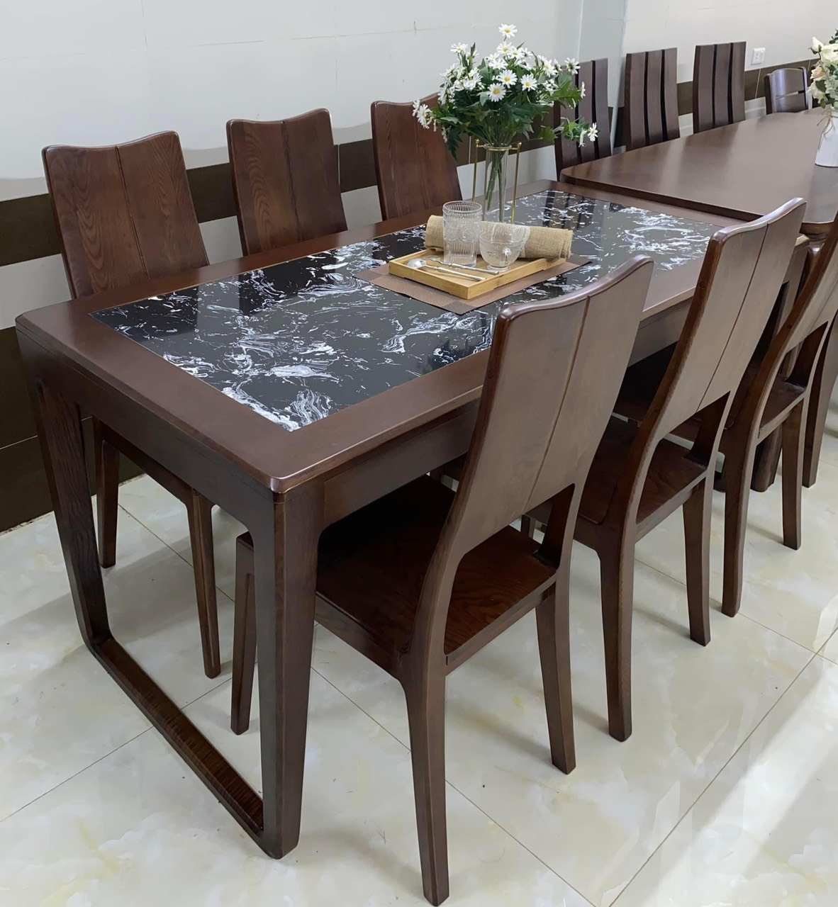 Bàn ăn gỗ sồi màu óc chó mặt đá hiện đại - Bộ 8 ghế
